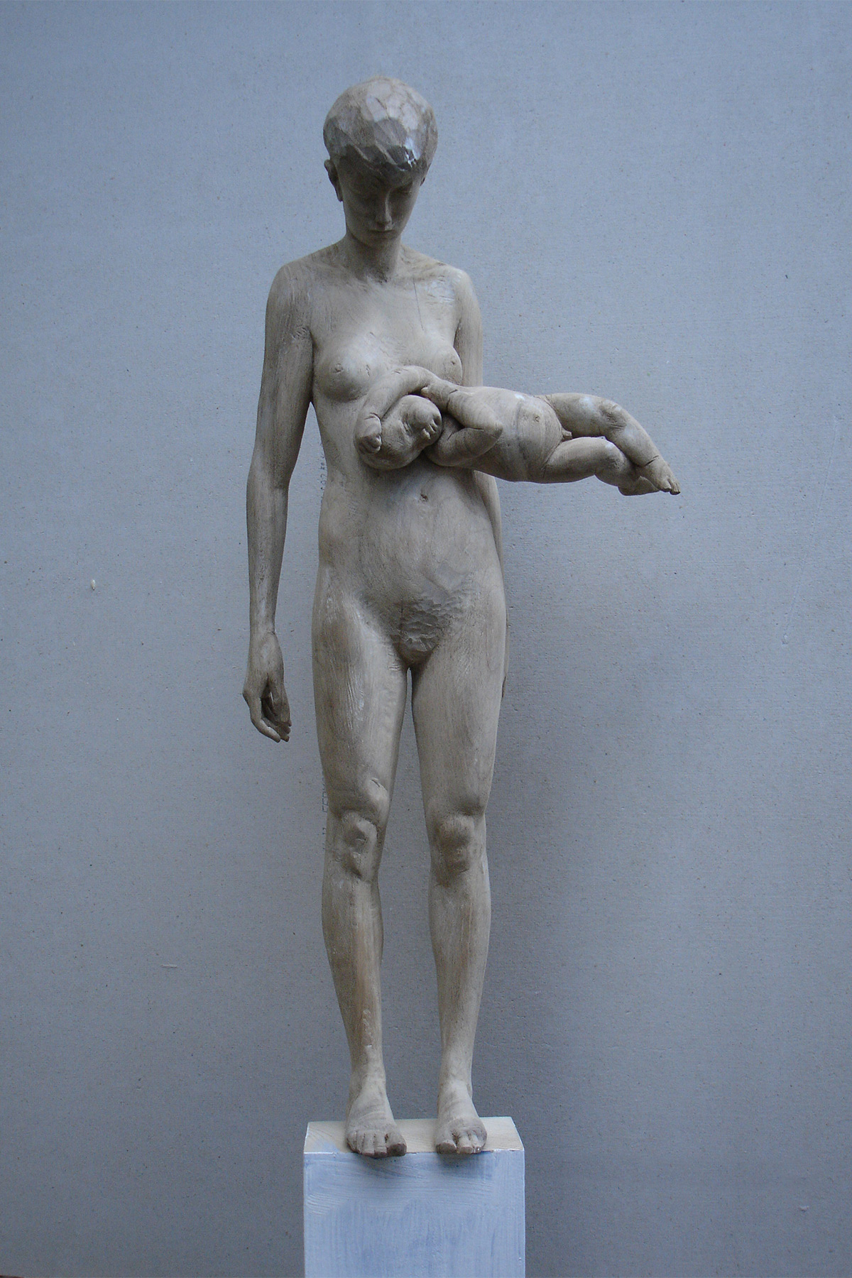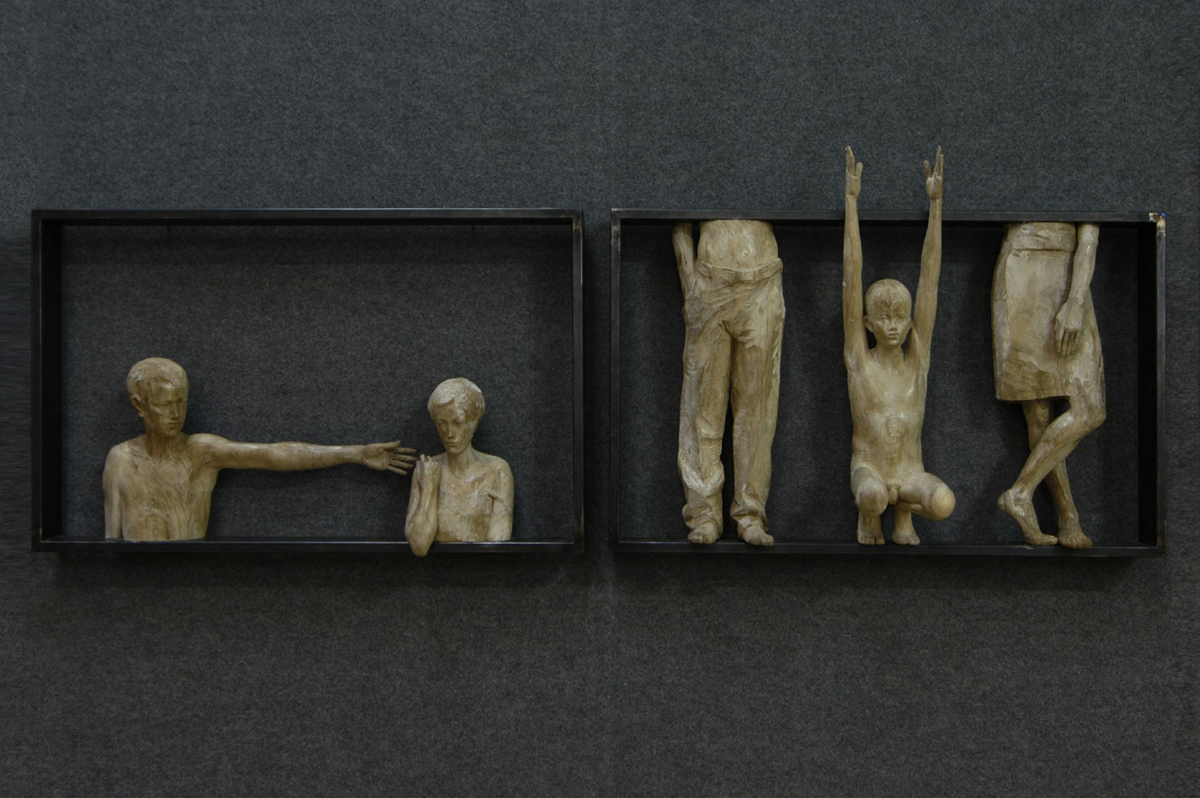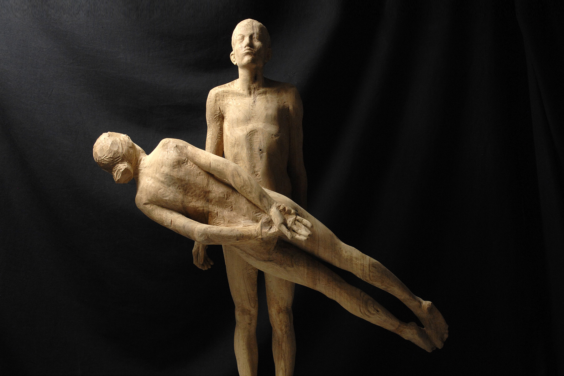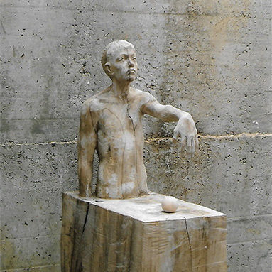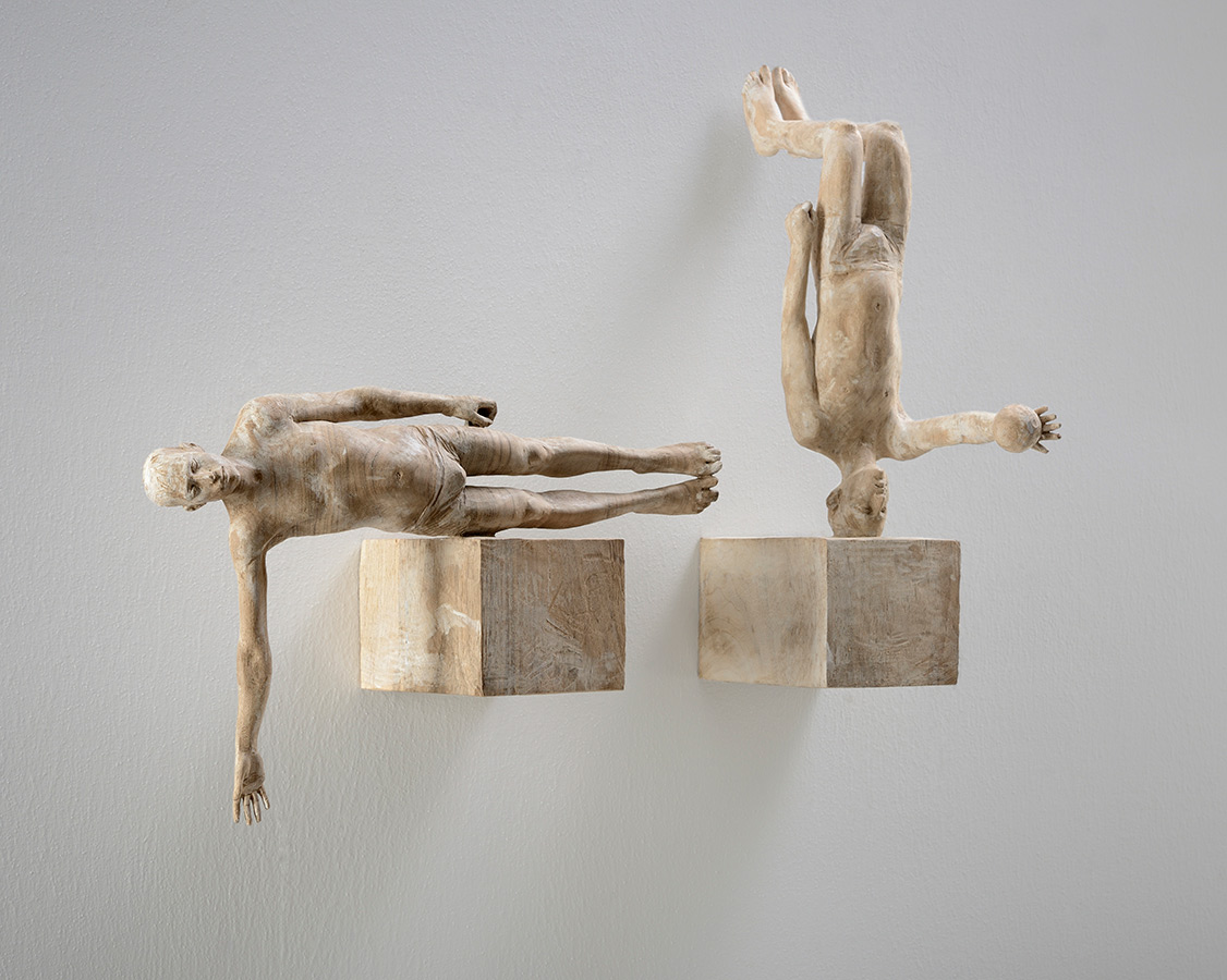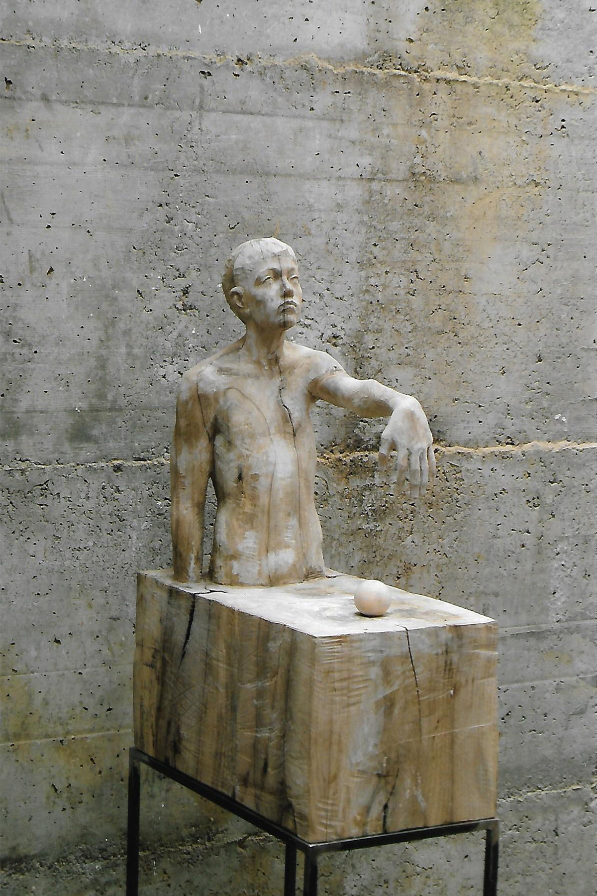 In a similar way as the figure, the artist Hubert Mussner often suggests their placement in an accurately defined space, thereby creating an imaginary atmosphere in which to explore the most intimate feelings and diverse aspects of human expression. The protagonists are in fact men and women, dissolved into wood. Their form is compact and light sculpts the surfaces in a way which enhances the adherence to reality. The figure’s poses result from a few orientations, the vertical and the horizontal, a slight inclination or direction. They open the perception an impressive view. In the balance of the forces of the figures is hidden the extraordinary impetus of life.