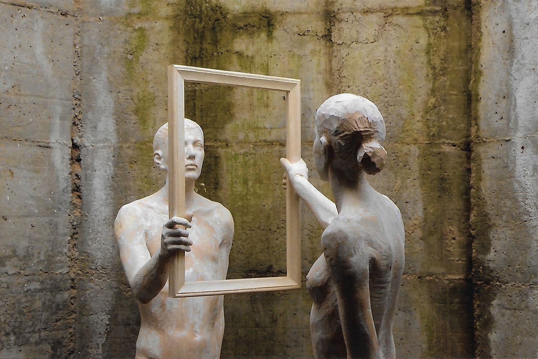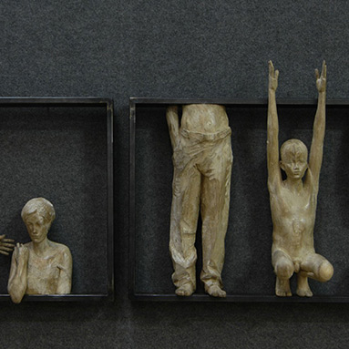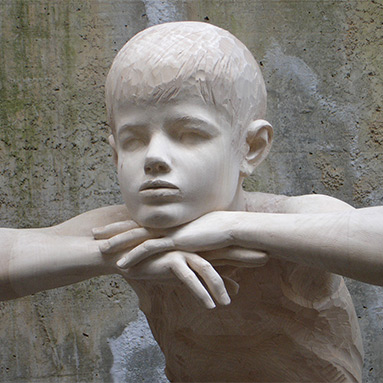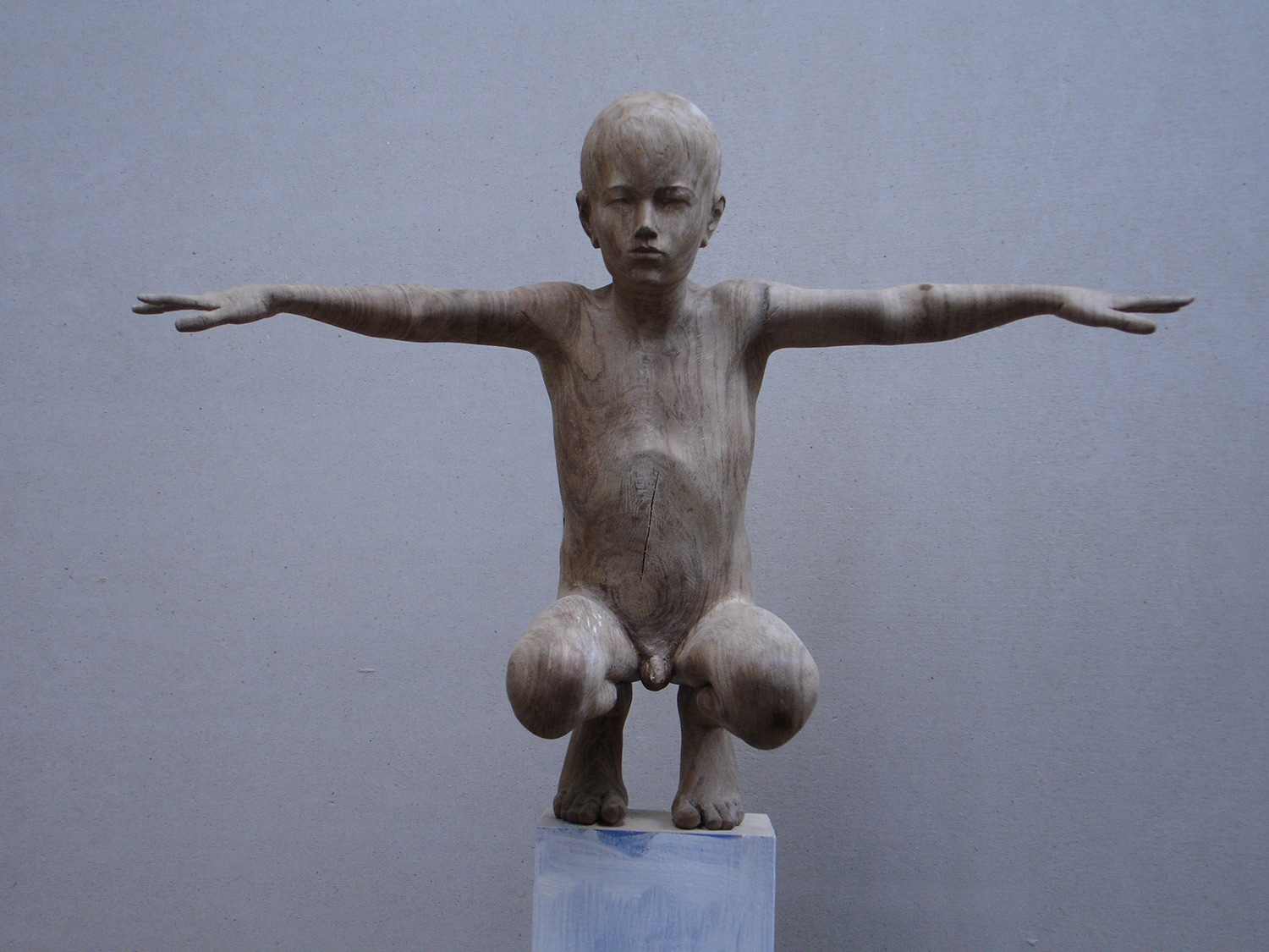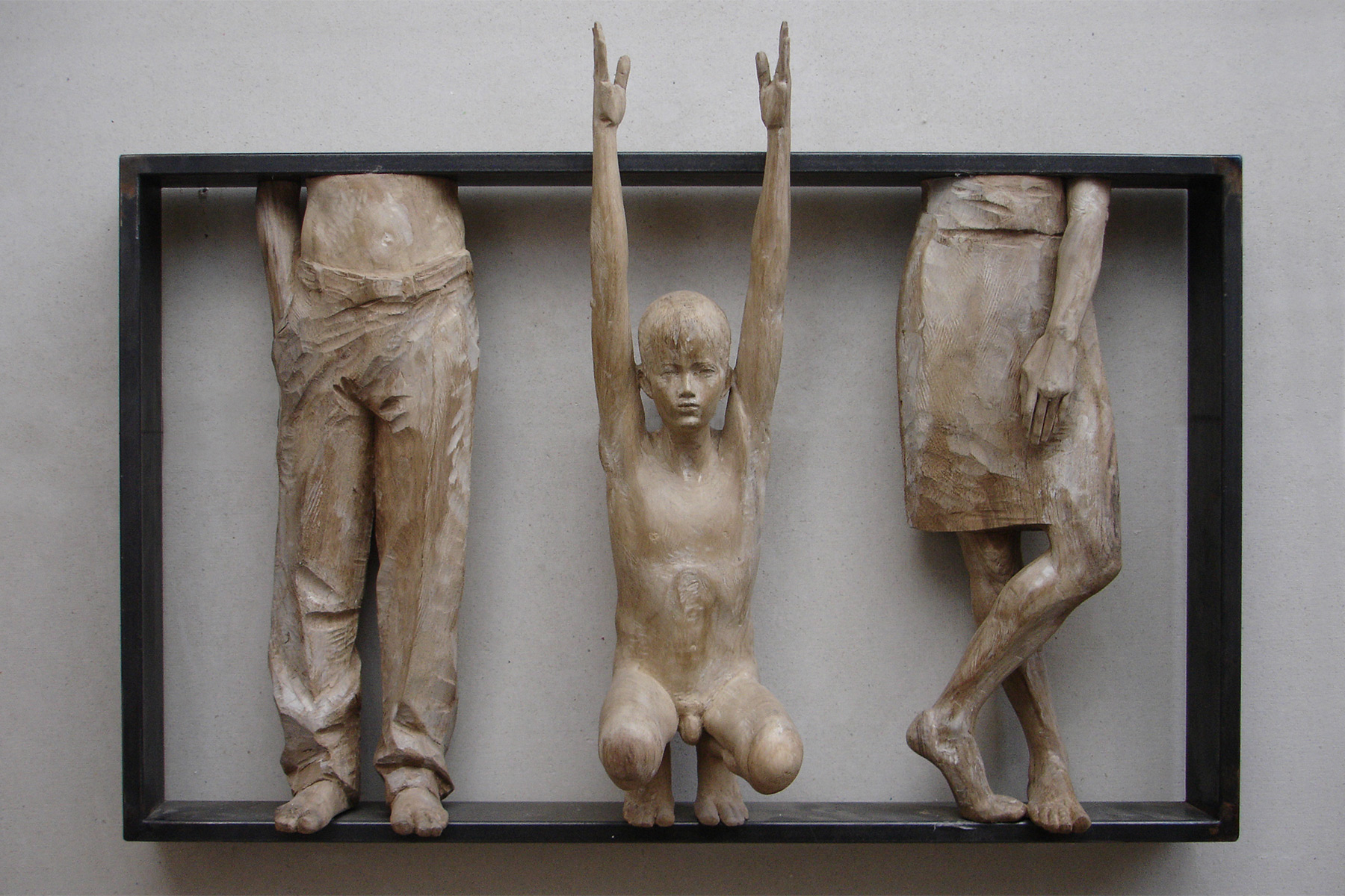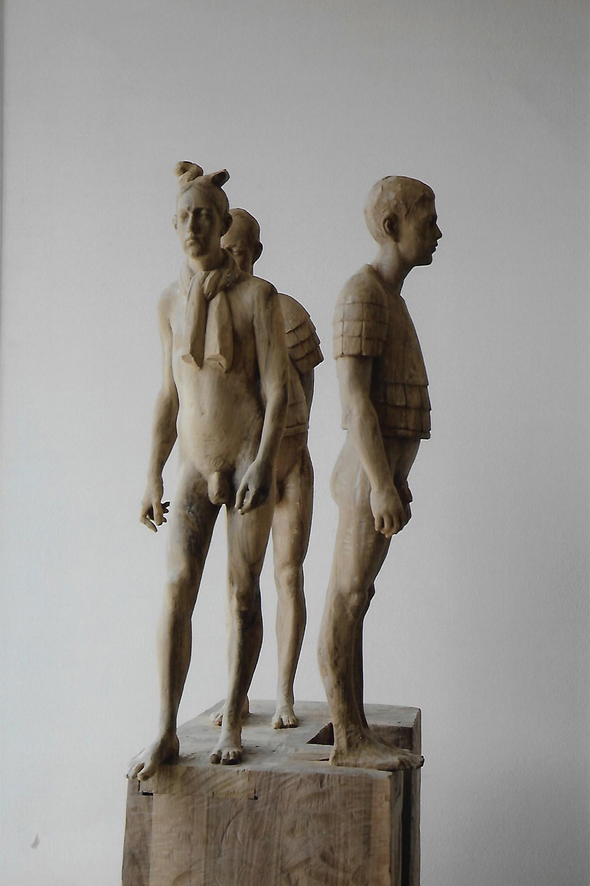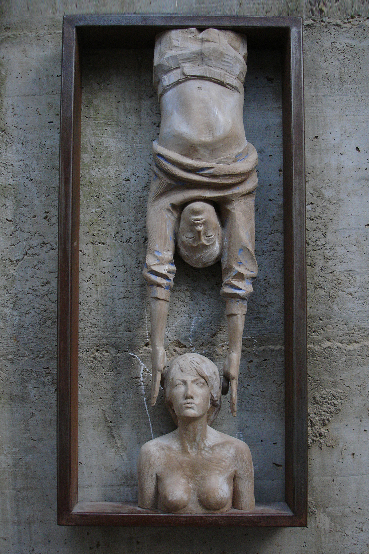 In a similar way as the figure, the artist Hubert Mussner often suggests their placement in an accurately defined space, thereby creating an imaginary atmosphere in which to explore the most intimate feelings and diverse aspects of human expression. The protagonists are in fact men and women, dissolved into wood. Their form is compact and light sculpts the surfaces in a way which enhances the adherence to reality. The figure’s poses result from a few orientations, the vertical and the horizontal, a slight inclination or direction. They open the perception an impressive view. In the balance of the forces of the figures is hidden the extraordinary impetus of life.
