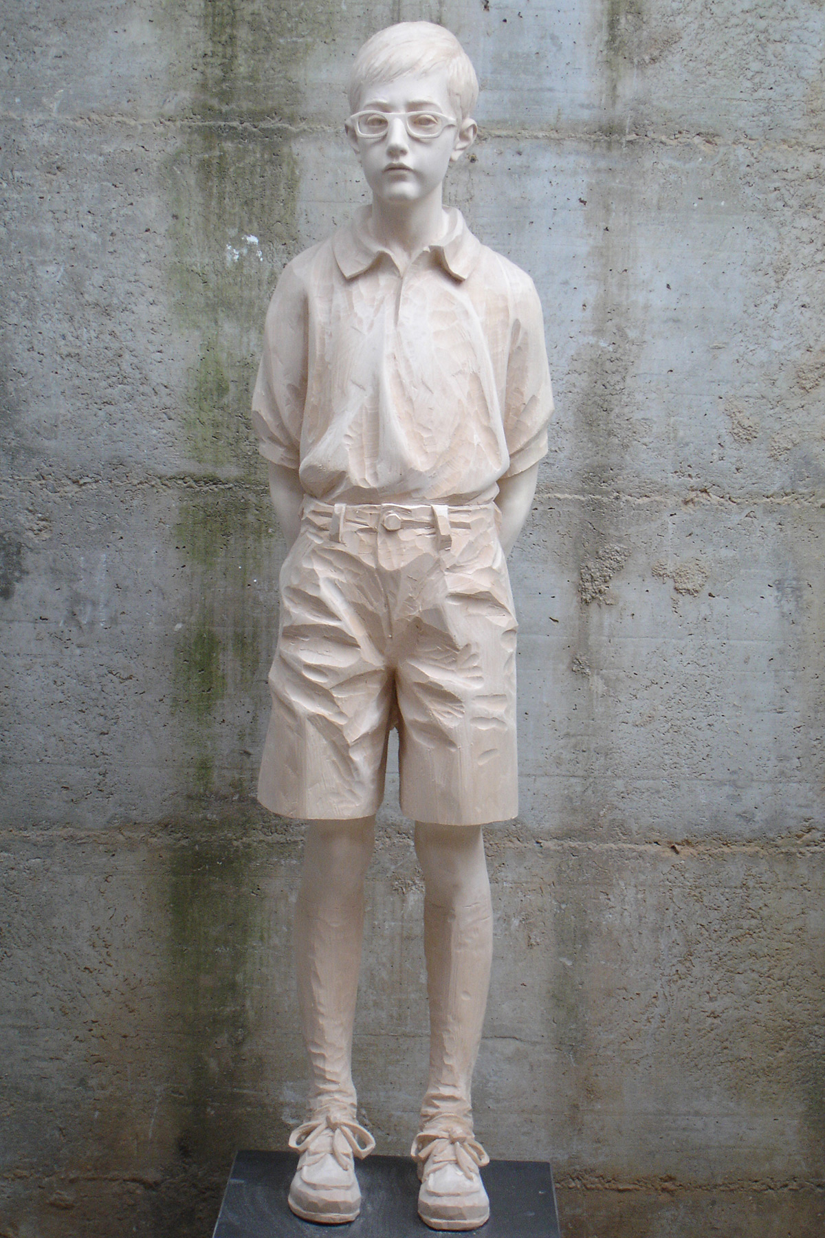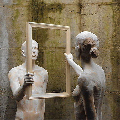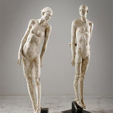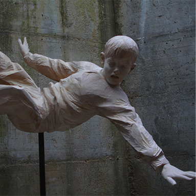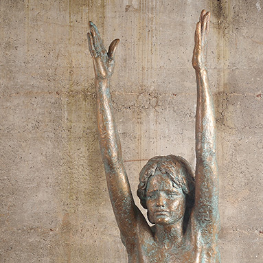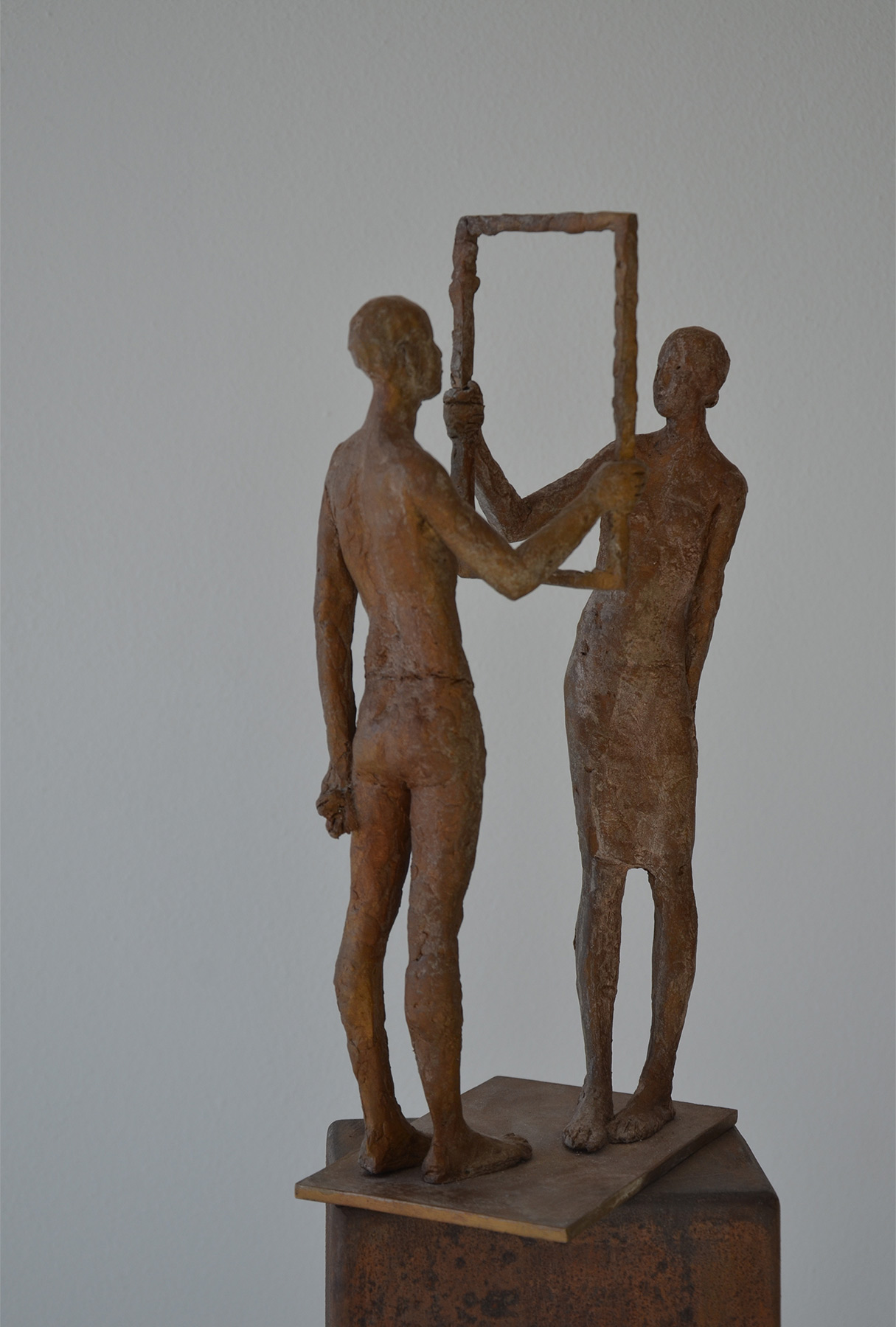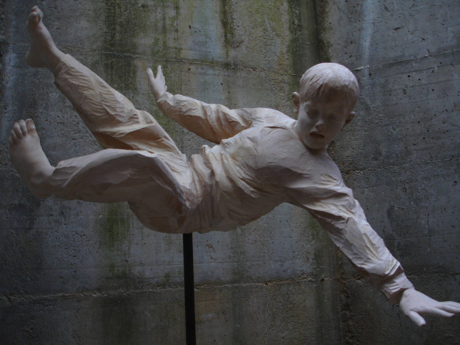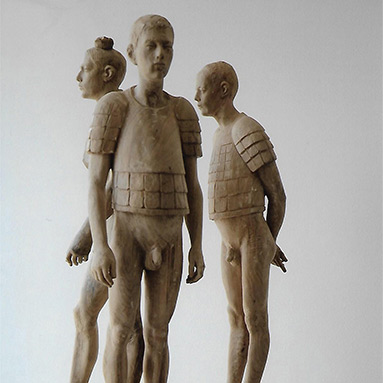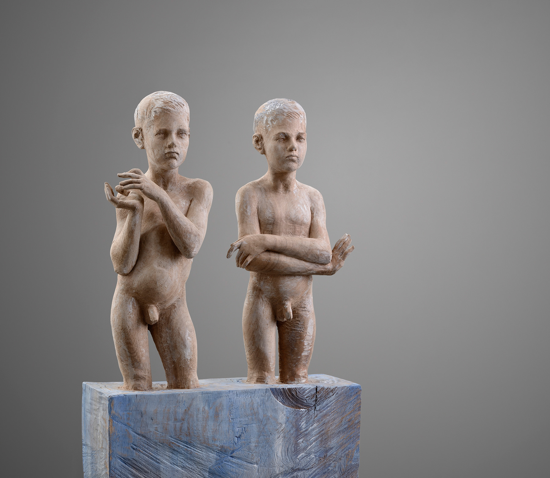 In a similar way as the figure, the artist Hubert Mussner often suggests their placement in an accurately defined space, thereby creating an imaginary atmosphere in which to explore the most intimate feelings and diverse aspects of human expression. The protagonists are in fact men and women, dissolved into wood. Their form is compact and light sculpts the surfaces in a way which enhances the adherence to reality. The figure’s poses result from a few orientations, the vertical and the horizontal, a slight inclination or direction. They open the perception an impressive view. In the balance of the forces of the figures is hidden the extraordinary impetus of life.