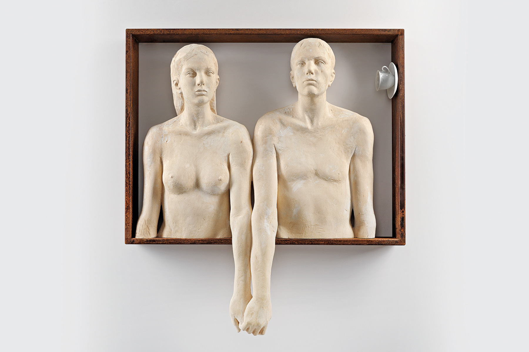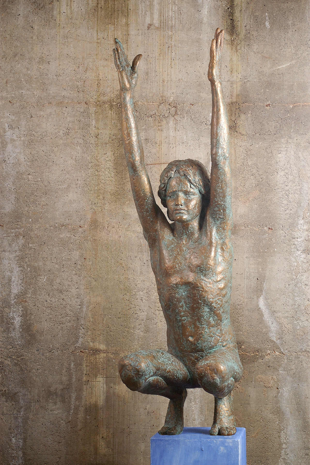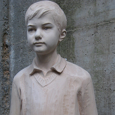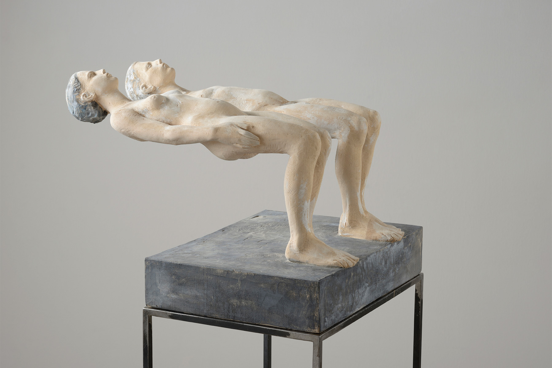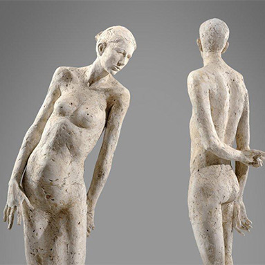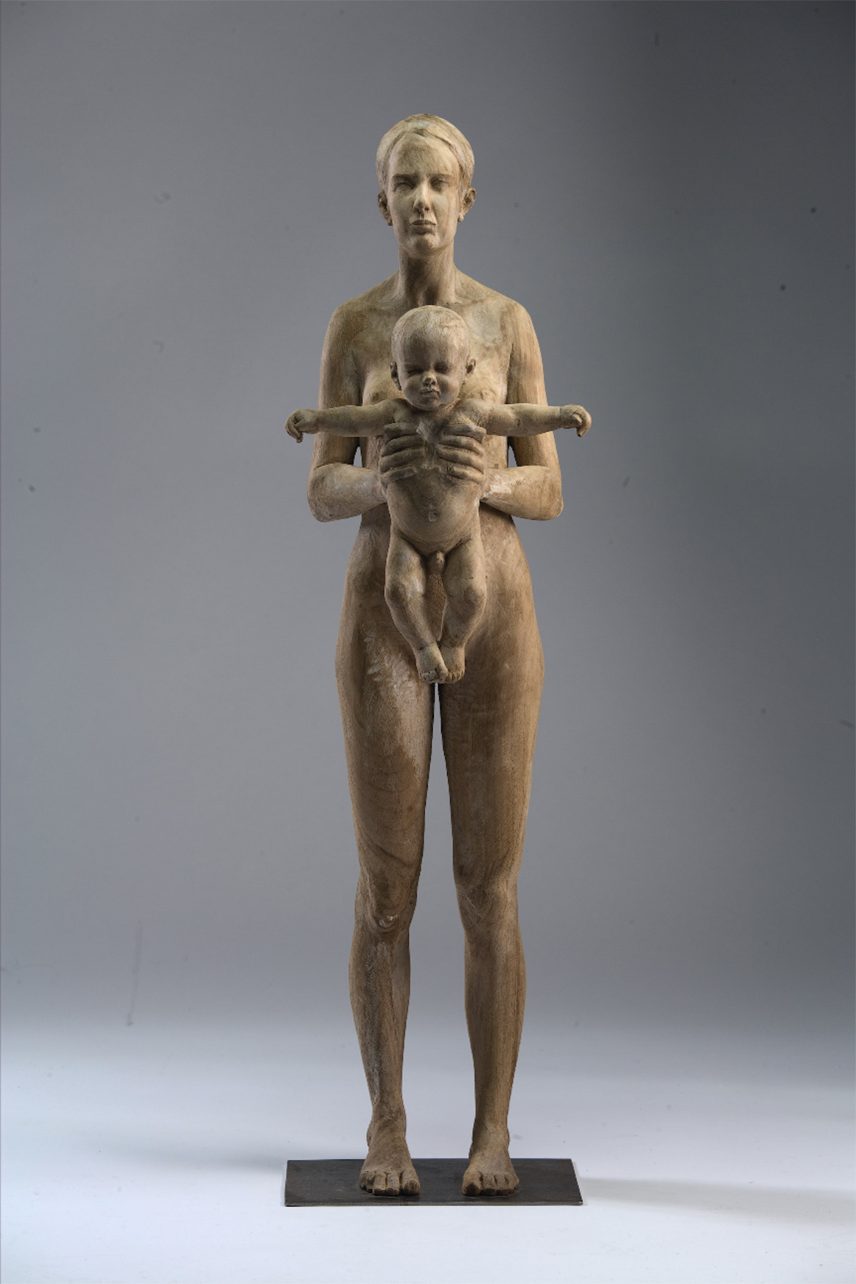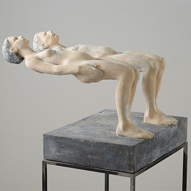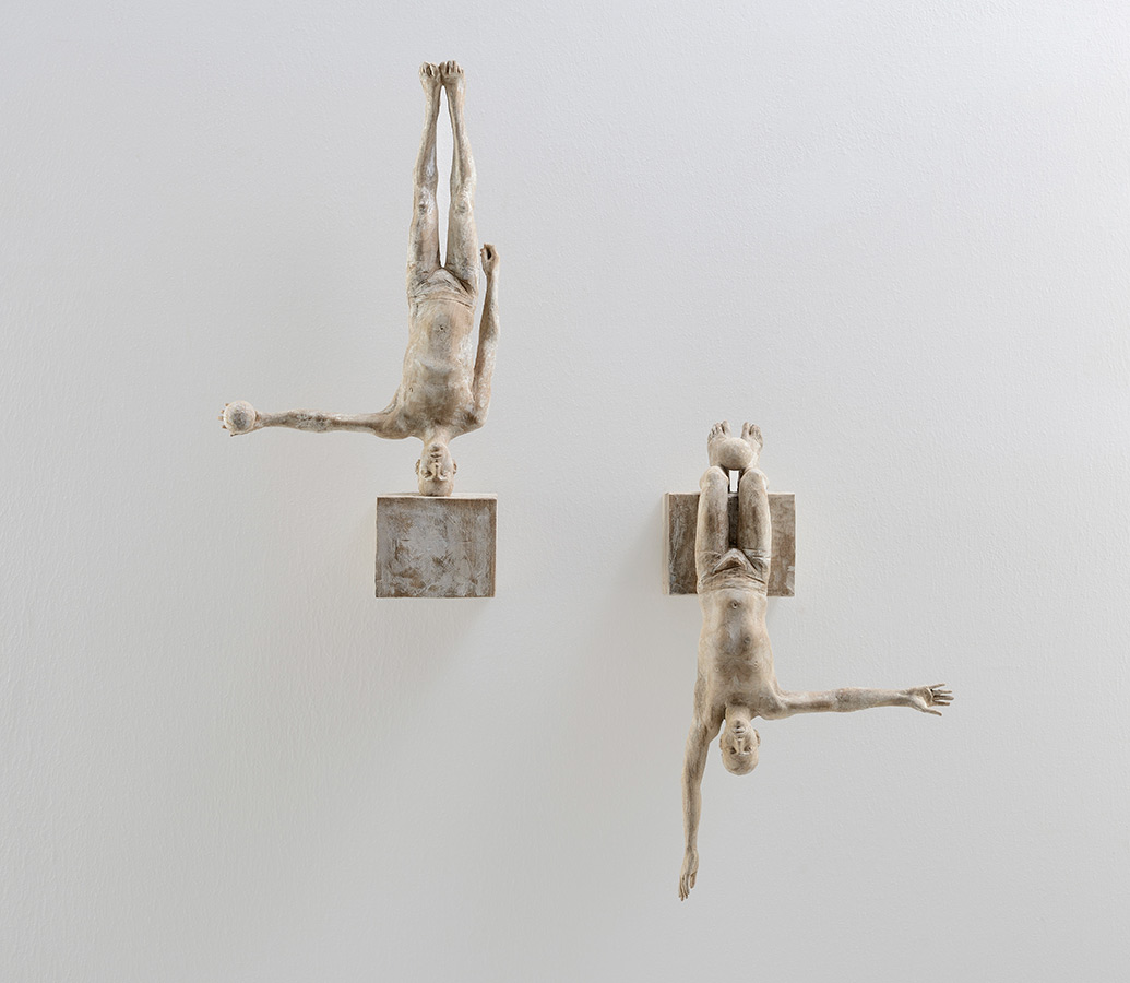 In a similar way as the figure, the artist Hubert Mussner often suggests their placement in an accurately defined space, thereby creating an imaginary atmosphere in which to explore the most intimate feelings and diverse aspects of human expression. The protagonists are in fact men and women, dissolved into wood. Their form is compact and light sculpts the surfaces in a way which enhances the adherence to reality. The figure’s poses result from a few orientations, the vertical and the horizontal, a slight inclination or direction. They open the perception an impressive view. In the balance of the forces of the figures is hidden the extraordinary impetus of life.